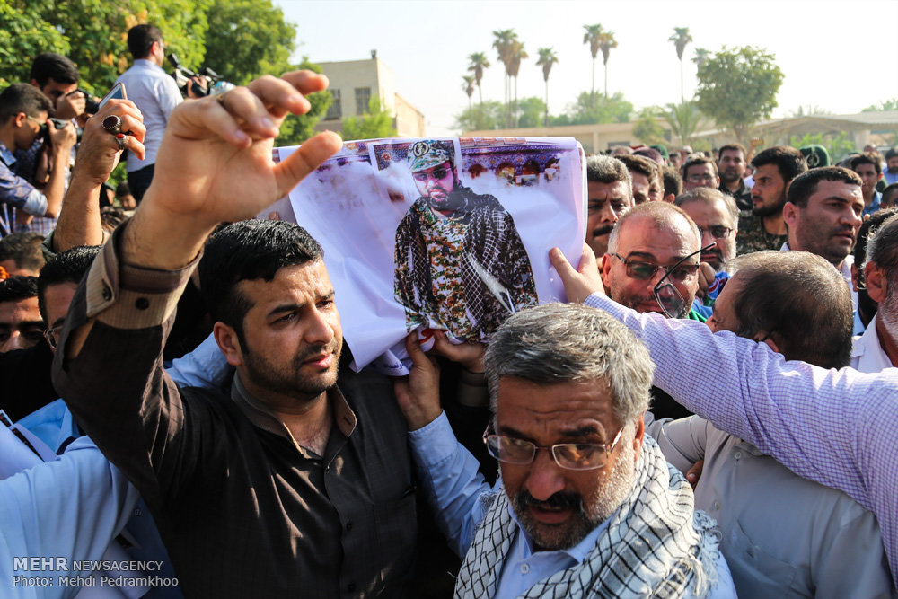 پیکر این شهید مدافع حرم پس از اقامه نماز با ندای الله اکبر، لااله الاالله، محمد رسول الله بر دستان مردم خوزستان قرار گرفت تا تشییع شود.